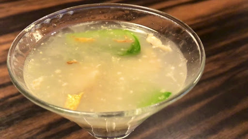 季節のオードブルは豚の旨煮のカクテルバブルスタイルきのこソース。 カクテルグラスに白いバブル。 フライドオニオンをバブルに落とすと、バブルが弾けてスモークがフワッと煙るシステムです。 きのこソースに豚の旨煮が入っていました。