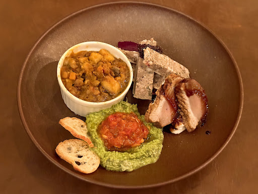 〈ドリンク〉 【CRAFT GIN & TONIC KUROMOJI + BERGAMOT】:1078円 【クロモンブラン(辛口) ハーフカラフェ】:2100円 . 〈メモ〉 岐阜グルメ旅2日目のランチとして伺ったお店 24年12月.水曜日の夜20時15分に2名で予約して伺い、店内3〜4割方埋まっているといった状況でした . ・TODAYS TAPAS4種 本日の前菜で気になるものを盛り合わせることが出来る贅沢なプレート 単体/4種/9種の盛り合わせができるとの事で今回は4種を選択 . 今回は「マグレキャナール鴨の自家製燻製」/「岐阜ボーノポークの自家製田舎風パテ」/「福井農園有機栽培セレベスとレンズ豆、自家製チョリソの煮込み」/「岐阜産ブロッコリーとケールのピュレと北海道産真鱈白子のトマト煮」の4種をオーダーです