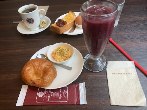 Read more初ビリオン珈琲☕︎ 喫茶店×カフェの融合というか私が今まで行った店としてはインパクトがあった気がする。新鮮と言えばいいのかな?🤣 雨の日で少し寒いかなぁと思ったから本当はホットにしようかと思ったけどメニューを見てアサイージュースに惹かれてしまった🥰多分私の知る限り県内では初めてだと思う。だから新鮮でつい! そして、モーニングのゆで卵の変更でたまごサラダも新鮮。それもなんとなく変わったものに惹かれる私はそれも選んでしまった。結果的に良かった。美味しかった。 言い忘れてしまったがバタークロワッサンも美味しかったよ。 お値段は他の所に比べたら若干高いかもだけど行ってみる価値はあると思う。 注文の時だったりお冷の声掛けだったり店員さんは良い雰囲気だったと思う。 敢えて気になることといえばトーストの時に小倉とかジャムとかどれが良いかっていうのがメニューでは分からなかったことかなぁ。あと席はお好きな席って有難い?のかもしれないけど入って両サイドに席が分かれているとどっちが空いてるとか分からないしとにかく初めてだから案内されるか若しくはこっち空いてますと...