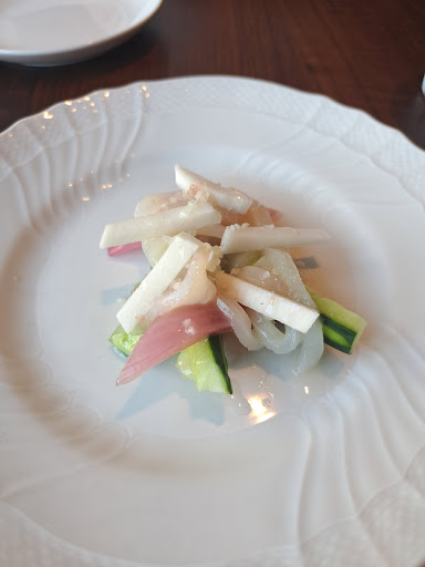 注文したのはランチ用のおまかせコース、5900円。 内容はこんな感じ。 ・アミューズ、いちじくとなんかのジュレ 生ハム添え ・冷前菜、メイチダイのカルパッチョ? ・温前菜、鶏肉とジャガイモとマッシュルームのなんか ・パン、全粒粉のパンとフォカッチャ ・スープ、スープドポワソン...