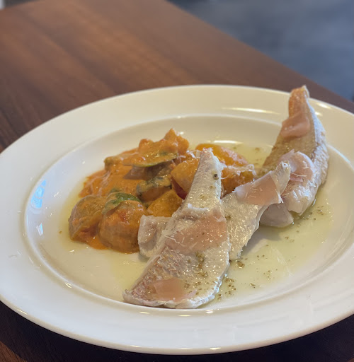 今回はランチでお邪魔しましたが、昼のみさせていただきました ショートコースです(2200円) ○ニンジンとオレンジのポタージュ生ハム、コンソメゼリーのせデュカかけ 生ハムの塩加減がいい感じでした ○サラダ フリルレタス きゅうり 玉ねぎのピクルス 真桑瓜 辛味大根 ○メイン 真鯛のポワレ&野菜のグリルのせ 魚は、もちろんですが野菜が甘くてとても美味しかったです 一緒にいったかたは、清流地鶏のコンフィをセレクトしました ○デザート 桃のコンポートに紅茶のジュレのせ