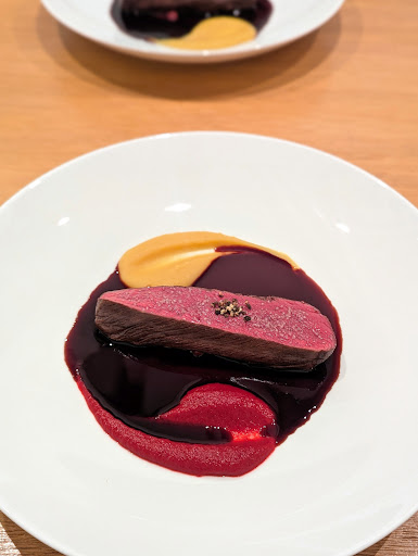 お肉料理は、鹿肉のロースト。そのビジュアルに、思わず溜息が出てしまう。カットする前、フォークとナイフを当てた時点で伝わってくるむにっとした感触に、ドキドキでナイフを入れる。