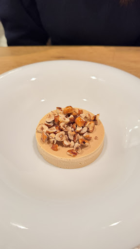 デザートは、キャラメルのパルフェ。キャラメルアイスに、キャラメリゼされたヘーゼルナッツがたっぷり乗せられている。(お誕生日仕様)