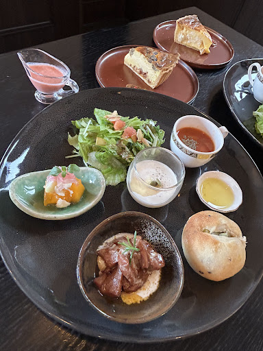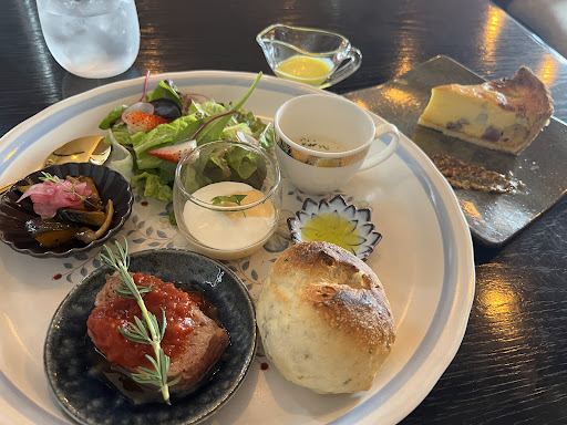 最初に出て来たプレートがオシャレで素敵♡ でも私は、映えだけゴハンには納得しない! さつまいものポタージュに柿のマリネといった季節野菜を使い、ドレッシングも自家製、キッシュに添えられた粒マスタードが、ミートローフにピッタリ♡ とても丁寧に作られていると感じた美味しいプレートに、ノックアウト⤴︎⤴︎⤴︎