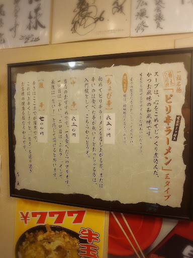 同行者の注文した、ピリ辛ラーメンも、辛いけど めちゃくちゃ美味しかった…との事 豚骨のような色目のスープですが、カツオ風味の和風味 『クセになる味』だそうです 麺の種類が、太麺・細麺・ちぢれ麺 から選べるのも良いですね
