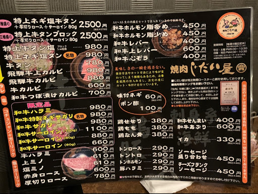 芥見界隈では安価で人気の時代屋です。 まず最初に本日のおすすめメニューを渡され、その中から特選サーロインと特上ネギタン塩を、通常メニューより飛騨牛上カルビ、和牛ホルモン脂多め、焼き野菜盛り、トントロ、鷄せせり、コーンバターを追加含め1〜3人前オーダーしました。 驚きは野菜盛り!これで1人前510円だったかな? 素晴らしいの一言ですね。 ただ⭐︎1つ減らしたのは涙が出るくらい換気が悪いのと、梅酒やソフトドリンクは薄くて水を飲んでる感じ… 接客に関してはとても元気で好印象でした。