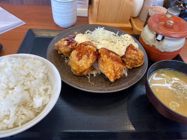 Read more唐揚げはサクサク、冷めてもサクサクで美味しかったです。 定食には、小さなツボに入ったイカの塩辛が付いてきたり、お味噌汁には有無を言わさずとろろ昆布が入っていたり、クセ強め。甘ダレとニンニクダレは付いてくるのに、塩コショウがテーブルにも置いて無い不思議。 レジのお姉さんはお忙しそうで、お釣りを渡したら挨拶もなく次の対応に行ってしまったのと、キャベツの千切りがパサパサで少し残念でした。
