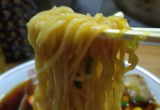真っ黒だけど しょっぱくはない、岐阜駅前にあった 懐かしい屋台ラーメンのようなスープに、ほどよく柔らかく すすりやすい 黄色の中華麺が絡みます 呑み後の ノドやお腹に染み渡りますよ そうそうこれこれ 美味しい! (もちろん、呑んでなくても 美味しいのですが)
