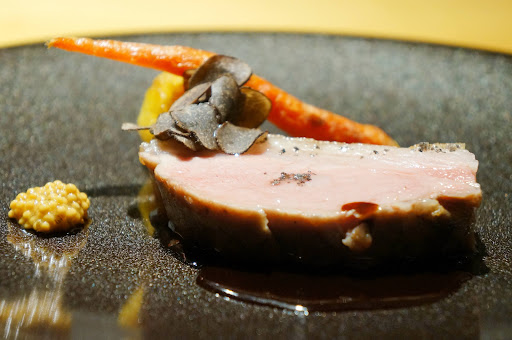 ・甘海老、金時人参 ・せいこ蟹、メロゴールド、クスクス ・パン ・雪アスパラガス、帆立貝 ・菊芋、蛤 ・甘鯛、蕪、アオリイカ ・虎河豚白子、グリンピース ・吉野猪、トリュフ、黒ニンニク ・ショコラ、洋梨 ・マスカルポーネ、味醂 ・小菓子、ドリンク
