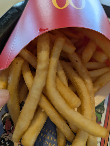 Read more家族4人で午後4時半に夕食として来店し店内で食べました。 クレーム① 他の口コミにもあるが、店員の態度が最悪。 注文待ちゼロの状態でカウンターに立ったが、 誰も声をかけてくれない。 もちろんスタッフはいる、目の前を他の作業の為に 何人も素通りする。 誰か一人くらい「少々お待ちくださいませ」と一声かけてくれないのか?「自分の仕事がある時は客なんか無視して待たしといたらよい」というマニュアルがあるのか? 「スマイル¥0円」はもともと期待していないとはいえ、やっとやってきたスタッフは「スマイル ー¥5000」くらい。 クレーム② 全員大好きなポテトがマクド人生ナンバーワンクラスの超残念な状態。 冷めている、焦げている、塩味が微小。