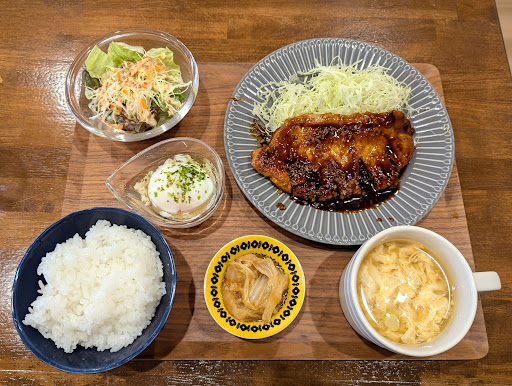 豚テキのランチを注文、2種類から選べるスープは卵をチョイス。しばらくすると、タレがしっかりと絡んだ豚テキランチが登場。テーブルに置かれた瞬間、ふわりと漂ういい匂いに思わずにやけちゃう。