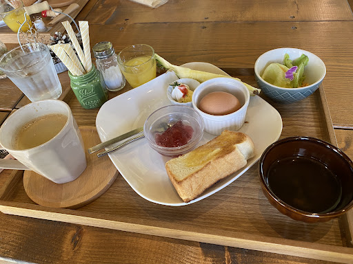・珈琲 ・トースト ・サラダ ・ゆで卵 ・スープ ・オレンジジュース ・フルーツ ・ゼリー ・ミニミニデザート 400円