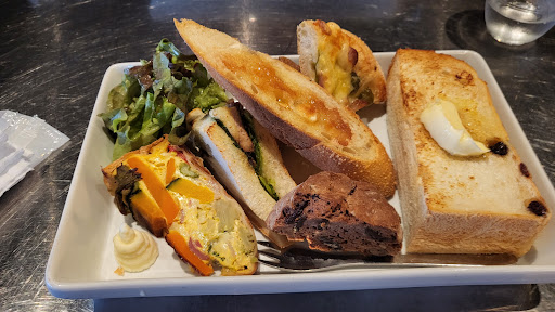 Read more岐阜市の古い町並みが残る、川原町の本通り沿いにあるカフェです。外見は古民家カフェで本通りから見ると看板も目に入りにくいので、全く気付かず通り過ぎてしまいました。通り過ぎたことに気付いて戻って来てグーグルマップを見ながら辺りを探しても分かりにくく、しばらくウロウロしてやっと分かりました。 店舗の横に駐車場があり、そちら側から裏手に回ると店内への入り口があります。町並みの景観を損ねないように、色々と規制があるようですね。 天気の良い行楽日和の土曜日、朝9時にお店に到着。評価が高いお店なので、行列覚悟で来ましたが並ぶことなく入店できました。 店内に入るとパンのショーケースがあり、それを眺めていると店員さんが声をかけてきてくれて、奥のほうに誘導してくれました。カフェスペースに入る時に一段段差があるので、転ばないように気をつけてくださいねと教えてくれました。 カフェスペースは朝の日差しが入って眩しいぐらい。清々しく、美味しくモーニングを食べるにはとても良い雰囲気です。店員さんは皆若い人達で、接客は優しく気遣いもしてくれて、 好感度も高く安心してリラックスできました。 メニューはドリンクを注文すると11:30まではモーニングプレートが無料でついてくるシステム。モーニングプレートはなんと7種類の大量のパンとミニサラダが付いてきます。 パンは自分で選ぶわけではなく、お任せなので 人によっても違うし 何が乗ってくるのか楽しみです。 ドリンクはホットコーヒーを注文しましたが、大きいカップで量が多いです、なるほど、これだけのパンを食べるには、たっぷりコーヒーが欲しいと思いました。値段はそれなりにしましたが(税込730円)、質の良いコーヒーで、優しい嫌な苦味のない飲みやすいコーヒーでした。 パンはトーストやキッシュ、バゲット、サンドイッチなど、どれもハズレのない美味しいものばかり。結構な量でしたが、最後まで美味しくペロッと食べてしまいました。 (食べきれなくても...