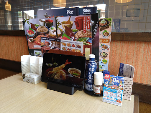 平日の15時頃だったので、駐車場に車は3台ほどでした。 注文はタブレットからですが、他の飲食店とは違いテーブルに置いてあるメニューをみて選び、タブレットには注文番号入れるだけの簡単操作でした。これなら、選び間違えることも注文したいメニューを探す手間もなく、わかりやすくて良かったです。 麺は、「うどん」「きしめん」「そば」の3つの中から選べ、「冷」か「温」かも選べるので良かったです。
