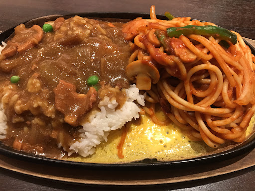 卵を敷いたアツアツの鉄板の上にナポリタンと生姜カレーが相盛りされたモリライスのビジュアルはなかなかにイイ感じ、味の方も濃厚ケチャップが太めのパスタにしっかり絡んだナポリタンは鉄板なだけに鉄板の美味しさ、一方の生姜カレーは独特な色合い、味の方も生姜がバッチリ効いていて辛さはそれほどでもないけど汗が出てきますね、ワタクシが得意でない大きめのタマネギの姿も見えますが食感がなくなるくらいしっかり煮込んであるのでコレならワタクシでも美味しくいただけます。ルーは途中で無くなってしまいましたが、ナポリタン先生が居るので問題なし、ナポリタン×ライスって組み合わせも好きなんですよね、美味しくいただけました。