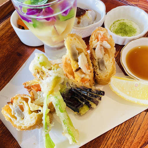 注文したのはランチの「東寺揚げと飛鳥汁定食」です。 白身のすり身と旬の野菜を湯葉で揚げた東寺揚げは初めて食べましたが、本当に美味しいです。 飛鳥汁も初めてのお料理でしたが、とても美味しいです。 小鉢の里芋や、ゼリーサラダなど、小鉢のお料理は、どれも手間がかかっていて味付けが上品です。