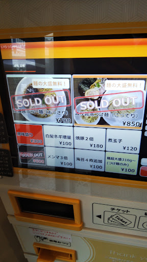 入口左手に券売機があり、食券を購入しますが、張り紙の通り「淡麗醤油らー麺(税込780円)」は売り切れとなっていましたので、「濃厚醤油つけ麺(税込850円)」を選びました。