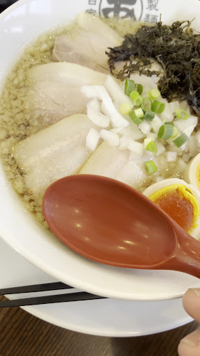合わせる自家製中太麺は、 もちもち食感で啜り心地も抜群! バラ海苔で磯の香りをプラス、 玉ねぎとネギの爽やかさでさらに後味を引き締める。 大盛り無料なのも最高で、 最後まで箸が止まらない一杯だった!