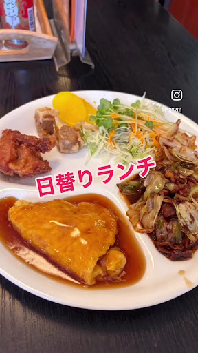 今日のランチはメインのマーボドーフが丸い器に。へこみのある大皿に千切りキャベツ、人参、水菜にかいわれ大根にサウザンドドレッシングサラダ。黄色い沢庵二枚。揚げシュウマイと唐揚げが一人に胡椒。餡掛けの玉子焼きオムレツ。どんぶりご飯。葱の入ったスープが付く。 とろみの強い醤油風味な麻婆ドーフがトロリと美味しい。餡掛けオムレツが天津丼風の中華らしい。ここの唐揚げ)シュウマイはカラット揚がって濃い味わい。バランスと種類のある日替りランチである。 中華スープとライスはランチでお替わり自由であるのも嬉しい。