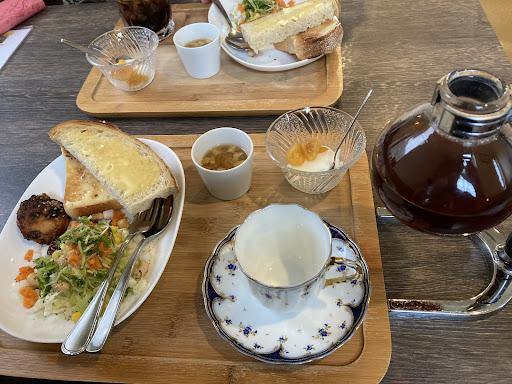 住宅街の中で見逃してしまいそうな住宅併設の小さな喫茶店です。モーニングに伺いました。 サラダが美味しい&ボリューム&適度な噛みごたえがあり、TVドラマの孤独のグルメの五郎さんの様に心の内を感動と共に食レポしそうになりますが、やめときます。 写真は、モーニング・サービス・プレートです。パンは、2種類から選択ですが、写真は1つづつ載せて貰ってます(2人で別々に頼んだものを1づつに載せて貰ってます)。美味しいですし、ボリュームも十分あります。お餅はサービスしてもらいました(団子?美味しかった)。ご馳走様でした。 キャパは12名程度。 お店のど真ん中に猫のケージがあり、たまにケージの中を飛び跳ねてます。店内も猫の調度品で飾られています。 席にメニューがないので、ドギマギしますが、お店の方が気さくなので大丈夫でした。 支払いは現金のみの様です。