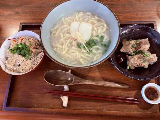 駐車場は、店舗の道向かい左20mの砂利地に34台。店内は、ボックスシート4セット・カウンター56席。 10月17日(沖縄そばの日)にイベントとして24時間営業をするとの事で、北部で用事が終わった後に21時頃入店しようとしたら満席。しばらく待ってから入れました。元スナックを改修した店内は、店主の趣味趣向を感じる手作り感あふれる明るい店です。満員のお客さんで慌てていましたが、お客さんで来た知り合いがお手伝いをしてくれて何とか回していました。今回は「塩炙りソーキそば(鶏出汁)」を注文しました(後からテーブルの注意書きを見たら、鶏出汁・豚出汁を選ぶなど用意されている注文用紙に書き込みして渡すらしい)。本来はセルフなはずの冷水も持ってきてくれました。 満員の店内・小さな厨房・ギリギリの数の食器類なので、ノンビリ待ってからお盆で持ってきてくれました。茶色の木箸です。スープは、チキンクリームスープをさらに鶏出汁でのばしてまろやかにした感じで飲みやすい味。麺は、自家製の縮れ中太麺でかなりコシが強いので1~2本づつユックリ食べるようです。「塩炙りソーキ」は、厚みのある軟骨ソーキで塩炊きなので甘くなくて、胡椒と赤実山椒が乗っていてとても美味しい。これだけで、酒のツマミにしたいくらい! 食後に支払いを済ませて店を出ましたが、次々と来店者がひっきりなし。後日インスタを見たら、想定外の事態で途中で売り切れ御免になったそうです。チャレンジ精神は素晴らしいので、またのイベン...