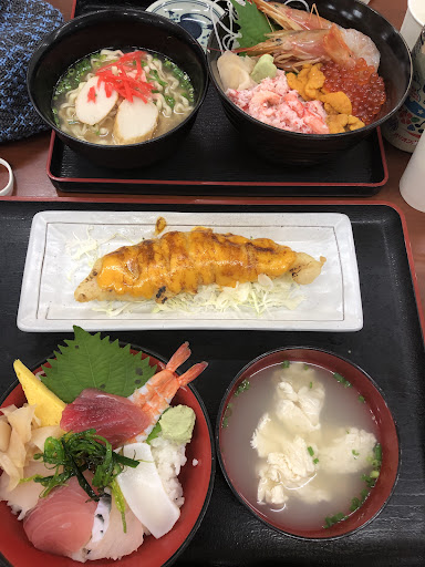 如果你去過了泡瀨漁港或泊港魚市場或者糸満漁港 不妨可以來試試這個不會有觀光客的漁港 位於宜野湾漁港內的一個市集裡面 停車位非常多 雖然裡面有3.4個食堂 但這間算是生意最好也是附近的人常去的海鮮食堂 大多賣丼飯較多種類很多 價錢也很便宜 那天去也沒看到外國客人 看起來大概坐滿9成有 牆上也掛著慶祝五周年很多地方產業及地方人物上支持的大面旗 雖然沒中文菜單但點餐其實不困難 所有菜單幾乎都有照片化或模型化 先找好座位後看想吃什麼 再到"お会計注文はこち"的地方跟正妹店員點餐 店員會跟你說免費的飲料在你的背後(忘記什麼茶了) 那天點了豪快海鮮丼 1200円 聽說放了高達15種類以上的料 サバ 鯖魚 マグロ 鮪魚 カンパチ 紅魽 アジ 竹筴魚 イカ 魷魚 サーモン 鮭魚 ウニ 海膽 いくら 鮭魚卵 帆立 帆立貝 えび 蝦 玉子焼 等等之類的啦 內容會看魚貨去做改變 幾乎都是當天附近海港直送的魚料 真的是非常豪邁的一大碗放滿滿的魚料 俗擱大碗擱好呷啦 回家整理照片才發現這間有賣烤龍蝦海膽 居然只要 伊勢えびウニ焼き 1800円 相對於泡賴漁港最便宜的烤龍蝦海膽set就要2900円... 可恨阿 居然沒看到 下次一定要怒點 店內還有一個聽說有兩公斤重的 mega丼 メガ丼 2000円可供挑戰 目前已經有9人挑戰完食了 有興趣的人可以去挑戰看看 吃完之後可以去附近超大一間的MEGAドン・キホーテ宜野湾店 MEGA唐吉訶德逛逛 停車位也非常多 需要注意的是這間唐吉訶德不是24小時喔