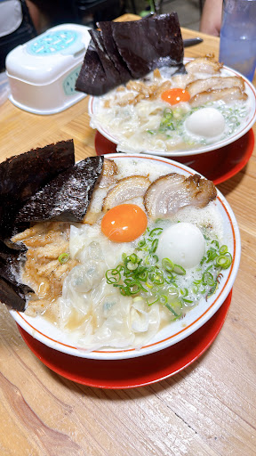 久留米ラーメン、初めて食べました。 濃厚豚骨なのに後味がさらりとした味わいスープでおいしい😋 チャーシューもホルモンもワンタンもぷるぷるで柔らかい✨ 有明海苔はスープに沈めるとスープの熱さで溶けていき、麺と絡みあって最高でした。途中で味変更用の調味料もたくさん。生にんにくもありました。麺の硬さも選べます。替え玉もOK。 餃子は肉餃子って感じで肉汁たっぷり!