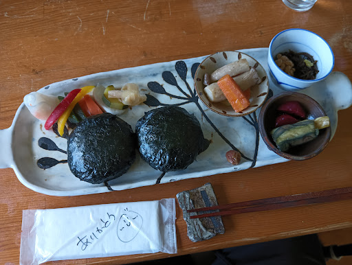 A couple? Onigiri shop run by a husband and wife? I ordered two onigiri for 1,650 yen. It was fun to choose from a variety of ingredients that you can't find anywhere else. The side dish was a vegetable pickle? Pickled vegetables? and small fish are the main side dishes. They seem to be very healthy. The taste may be different for different tastes. The taste is unique and I feel that they have a good sense of taste, such as kachuyu with sansho (Japanese pepper), natto with mozuku seaweed and yuzu kosho (citrus fruit). There is a parking lot in front of the restaurant, and if you push yourself, you can park 3 or 4 cars. The prices are high, the location, etc., and the restaurant smells a little like a cat? (There may not be any cats). All of these are differences in likes and dislikes. I thought it would be nice to order onigiri by phone and take them home...