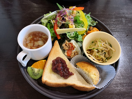 リッチモーニング750円とティーのホットを頼みました。 ヨーグルトにはグラノーラが載っていて、少し酸味のあるもやしの和え物、サラダにスープにマフィン(半分)に小倉トーストというラインナップ。