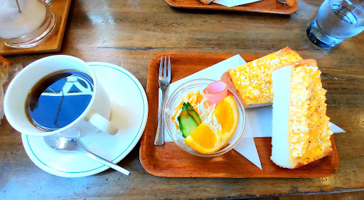 モーニングサービスはドリンクに+100円でいただくことが出来ます。 シャキシャキサラダにフルーツも乗っていて トーストはエッグトースト 卵サラダがたっぷり乗っていて食パンは厚みがあり 食べ応えがあります。 トーストでサックリ中はふわふわでおいしかったです。