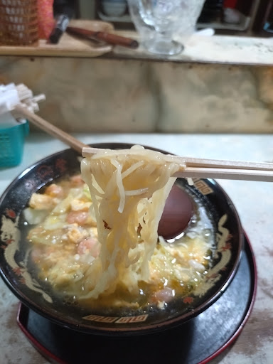 Read moreえびラーメン ¥600を注文。 あっさりスープに細い弱縮れ麺で、キャベツ、えび、玉ねぎ、豚肉、卵が餡掛けになってかかってます。ダマになった片栗粉が多数入ってたのでトロミは弱かったです。あと麺も少しダマになってました。価格が安いので多少ダマになってるのは目をつぶると言うのであれ...
