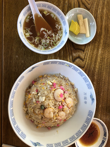 さて、上チャーハンですが どんぶりに入ってきたのがインパクト大! 量も多めでそりゃ万福亭って名前だわと ここでも納得。 エビとなるととグリーンピースが入ってるオーソドックスなチャーハンでしたが やはり上なのでエビが結構入ってました。 味はコショウが効いてて結構味が濃いチャーハンでした。 津軽人なら好みでしょう! 餃子も野菜が多くて味もしっかりして美味しかったです。