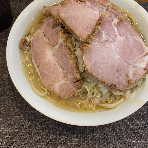 スープは透明系で、乳化タイプではありませんが個人的には美味しいと思います。もう少し動物系のコクが欲しいかな。食べ終わったあとの舌のヒリヒリ感があまりないので化調は少なめのような気がします。二郎そのものの味を求める方には少し物足りないかもしれません。 麺も美味しかった。濃い味を好まれる方は麺硬めタレ多めが良いかも。 ぶた(チャーシュー)が一番驚きました。スマホくらいの大きさで厚さ1cmくらいはあるでしょうか。肩ロースに下味をしっかりつけてるようなのでスープに合わせた味付けだと思います。 野菜も鶏油を絡ませてあるのか、美味しく感じました。ニンニクみじん切りも辛すぎることなくちょうど良い。