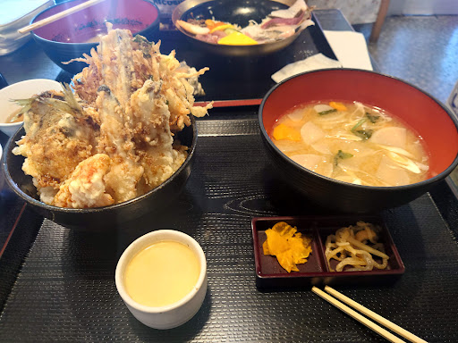 Read more見せ前到着10:50並び方が解らず、一組さきを越されましたが、6組目で着席!ちなみに割烹入口とお食事処入口が違う、並びもルールがないので、雰囲気で……注意が必要です( ・ั﹏・ั) 注文は着席順に聞かれるので、慌てずゆっくりメニュー選択出来るので、優柔不断な方には素敵な手順です(^3^♪ 私はかき揚げ定食注文で揚げ時間が30分以上掛るとのことで、新作の地魚天丼へ変更し、妻は特上日替り海鮮丼をチョイス(•‿•) 待つこと………………入店から1時間……ようやく海鮮丼が到着し……更に15分後天丼到着長かったけど、ボリューム感に圧倒され撮影会を終了して実食!今日は小アジ3、小金目1、鰆?2、ナス1、かき揚げ2かなりのボリューム…(・o・;)かき揚げ辞めて正解(^∇^)ノ♪揚げたてのみ天婦羅をパクリ!熱々ふわっふわっな魚の天婦羅に甘辛いタレが絡みウマ!かき揚げは玉ねぎ、ごぼう、人参、小海老でこの量で本当に良かったと味わい(´ω`)食べ進めること後半にナスを食べ、未だカリッとした食感に驚き、最後まで箸が止まることなく完食です! かなりボリューミーなので普通の大食漢であれば満足できる美味しさでした!最後にアラ汁はおすすめしません!日替り海鮮丼も……なのでこの評価です(^_^メ)ごめんなさい。 基本はその日のおすすめを注文時に教えてくれるので、その辺頼むと価値観アップしそうなので食べたい調理方法(生、焼、揚げ、煮付)でおすすめで決めるのが満足度高そう*・゜゚(^O^)↝ ご馳走様でした(◍•ᴗ...
