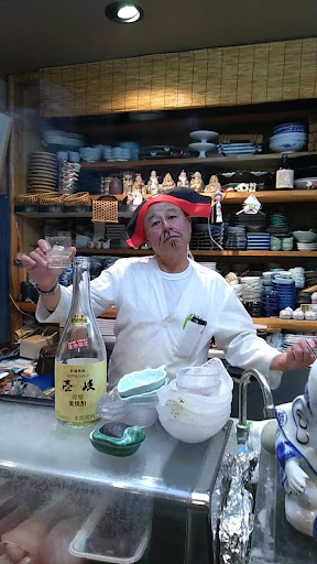 (接客) 地元の人達も観光客も分け隔てなく歓待してもらえる、気さくな人柄のオーナーと女将さん。オーナーは食い倒れの街大阪で長年料理修業され、お父様の後を受け、帰島してこの店を営業されている。 料理もトークも含めて、お客さんに喜んで帰って貰いたいという想いが伝わってきます。 時々オーナーさんがのってくると、変装して登場、お客さんの笑いを誘います。