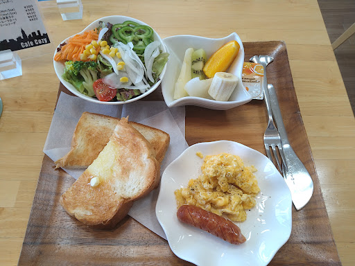 モーニングをいただきました。 トースト、コーヒー、スクランブルエッグ、ソーセージ、サラダ、フルーツ、まで付いて満足美味しかったです。サラダが冷たいのがいいですね。 女性が作られてる感じが好きです。