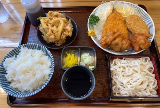 Read more土曜の午後に伺いました。 残念ですがお目当ての刺身定食は無し。 ミックスフライ定食うどんセットと焼きさば定食を頂きました。 油のせいでしょうか…揚げ物はちょっと胃がもたれる感じ。 おすすめはうどんです。 うどんは細めでちぢれ有りの麺、腰も程よくもちもち感の強い麺でとても美味しい。 うどんメニューでは、並、中、大、特盛とありますが男性だと大、女性でも中を注文されている方が多かったです。大だと見た目は凄い量ですが皆さん普通に食べてました。 次回は肉汁うどんを食べようと思います。 駐車場はお店の横にあり9〜10台程度停められます。