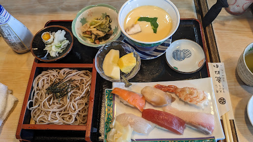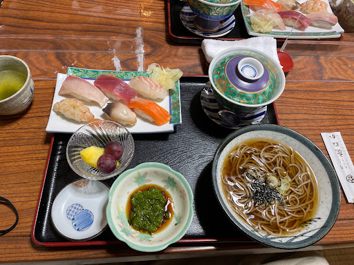 Read more念願叶って本日妻と2人でお邪魔しました。12時ちょい過ぎに伺いました。 カウンターとテーブル席3つ、座敷席が2つあるので結構余裕で入れました。車で行かれる方は道路を挟み反対側に駐車場があります。 いろいろ食べたいものが有って、悩んだ末にすしランチ1,100円を頂きました。 もう、大満足です。写真のようにお寿司、大きい茶碗蒸し、小鉢(メカブでした)お蕎麦、フルーツ、コーヒーが付いています。お蕎麦は温かいのか冷たいのが選べます。 お腹いっぱいで大満足です。茶碗蒸しも海老、栗、鶏肉、ナルトなど沢山でランチと思えないくらい大きかったです。 お寿司は勿論美味しい。お寿司屋さんなのにメニューが多く、次は何を食べようか悩んでしまいます。 提供に少し時間が掛かるので時間に余裕を持って行くのがいいと思い...