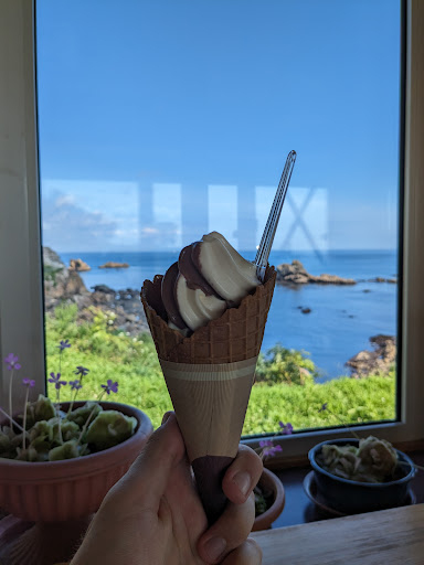 The ice cream was perfect in the heat, and the potato churro was good. It's wasn't very strongly flavored, not very salty, but still good. I also got fries, which hit the spot for my salty potato needs. Ended up getting another ice cream to go so I could take it with me and walk up on the observation deck by the sea. Fantastic place - I recommend sitting inside for a while (the ceiling is really cool) but also spending time outside, in whichever order you prefer. They have seating outside as well. There are two order windows, one that opens directly to the outside and one inside, so you can sit down or take your snacks to go. It's mainly ice cream (a good few varieties) and...