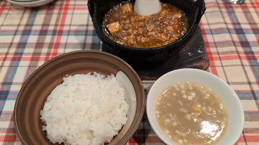 麻婆豆腐が美味しいという話を聞き入店。麻婆豆腐のセット?を注文。出てくると火鍋でグツグツ、バチバチとしている麻婆豆腐が出てきてそれだけで期待と食欲をそそられる。その他にもご飯、スープ、ザーサイ、杏仁豆腐もついてくる。肝心の麻婆豆腐は辛味が強いが山椒や花椒のような痺れ系ではなくシンプルな辛味系という感じである。その辛味としてはまあまあ辛いがご飯と一緒に食べるとちょうど良い辛さとなり食べる手が止まらなくなる。食べていると麻婆豆腐が油っぽく感じてくるが付け合わせのザーサイとスープが良い感じにさっぱりさせてくれる。麻婆豆腐を食べた後の杏仁豆腐も締めとしてとても美味しい。味もさることながらこの火鍋のインパクトは是非とも体感して欲しい。ただ辛いものが苦手な人は...