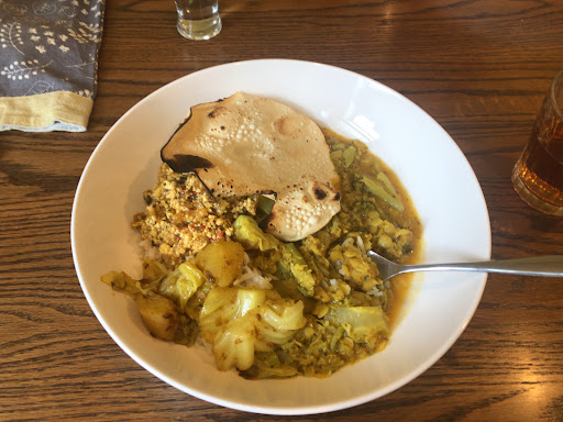 裏通りにあるため、入りずらいです。 入ると個性的に店主がお出迎え。本日のメニューを説明してくれます。メニューは1つのみです。本日はダルカレーとパニールのカレーです。お米はインディカ米?タイ米?で日本のようなねっとりしたカレーを想像しない方がいいです。サッパリとした口当たりは優しい感じです。カレーの上のパパドもコゲ目がいい感じです。最初は薄味かなって感じましたが食べて行くうちに「これはいいかも」となりました。
