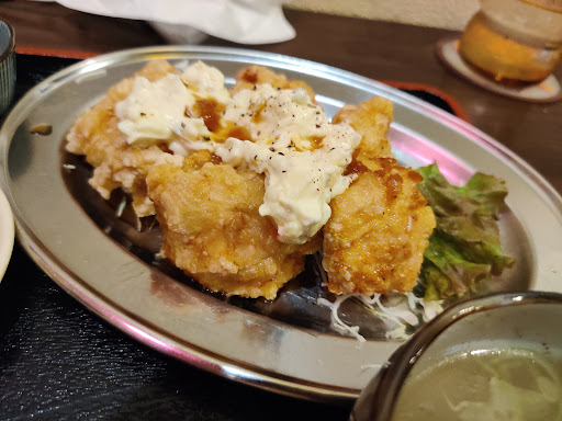 We had the chicken tartar dinner set, it was delicious and a unique experience. We also had a macaroni salad which was good. Total cost was 4400 yen for two, ouch