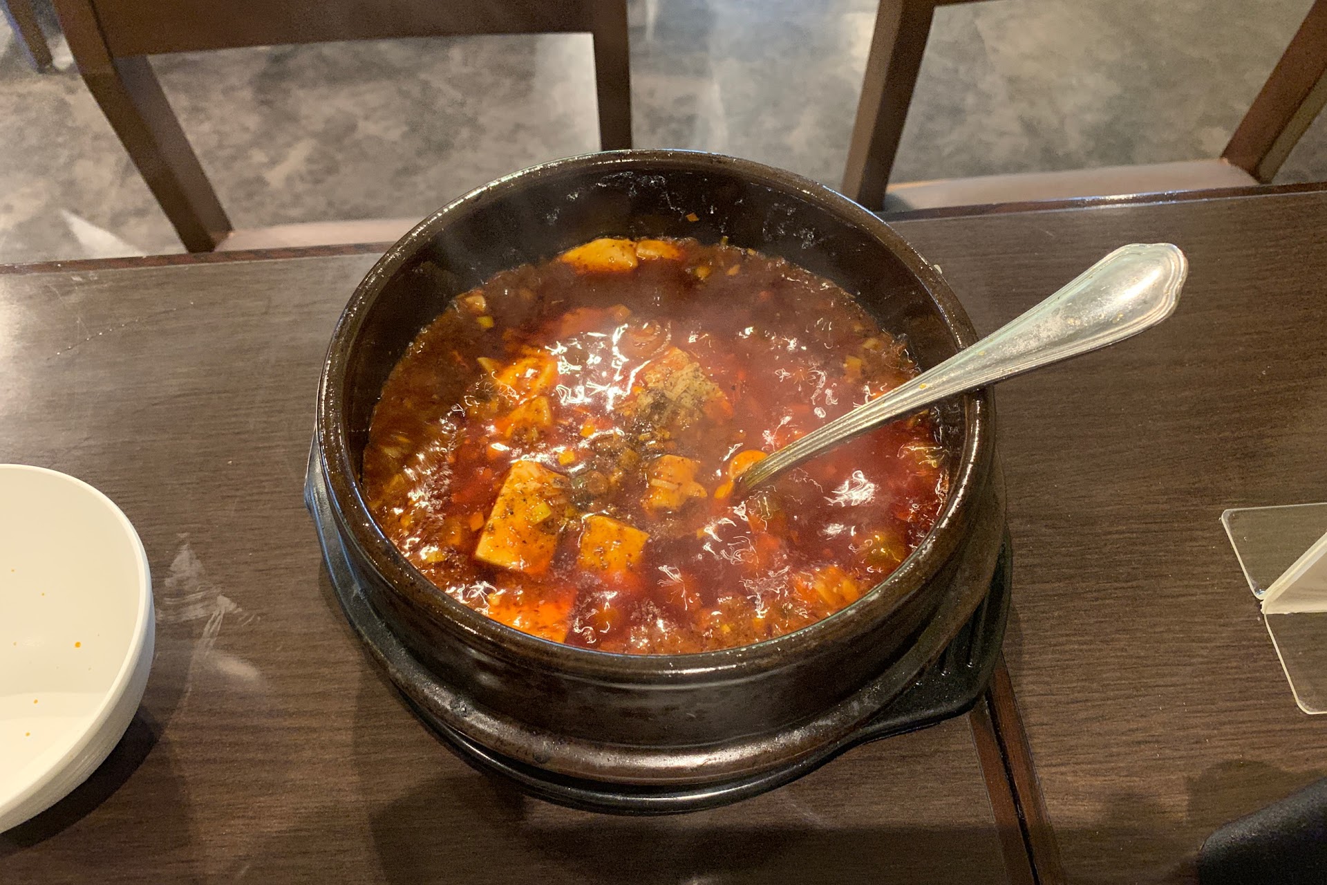 それから程なくして麻婆豆腐が登場。土鍋に入った状態でグツグツと煮え立ちながら現れたその姿に、一瞬動画を撮るべきかと迷いました。 特筆すべきは、とにかく熱い! 注文したのは1番上の大辛でしたが、辛さよりも熱さの方が際立ち、何度か舌をヤケドしそうになりました。 口に含んで味わえる熱さになったのが15分程経った頃。 やはり辛さは控えめで、味付けもご飯に合うタイプではなく単品で楽しむタイプであったように思います。