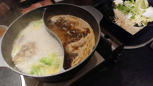 私はこちらに伺うと鍋の料理をいただきます 1人ずつガスレンジの上に大きな鍋を用意してくれ、お肉 かもつ鍋を選べるタイプです。