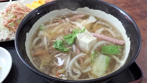 オーダーしたのは「みそ汁定食(ポーク有り)」で、沖縄のみそ汁の特徴は、何と言っても具と汁が多いこと。どんぶりに野菜や豆腐、お肉などがたっぷり入っています。なので、みそ汁定食というのが成立するんですね。ほっこりした感じの優しいお味で、付け合わせを含めてボリュ...