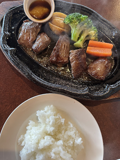 Read more交差点の角に店舗はあります、 駐車場は店舗前に停められ、店舗への入り口と出口が分かれています、決して広くはない店内です。 オーダーすると沖縄ではステーキ屋定番のスープにサラダが提供され、ステーキの提供めめちゃくちゃ速いです、ソースはココット皿に別盛りされ、ガロニは皮付きフライドポテト、ブロッコリー、 キャロットグラッセ、 とても、柔らかいステーキは 肉の旨味も感じられ米飯もススミます、サクッと米飯を平らげ おかわりして200グラムのステーキと米飯2杯食べて 大満足でした。 チェーン店とは異なり 街のステーキ屋さんもと...