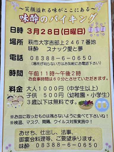Read more萩バスセンターから防長バスと吉部生活バスを乗り継いで猫寺まで行った際、帰りのバスを待つついでにこちらでお昼ご飯を食べました。税込1,080円の生姜焼き定食は大変なボリューム、とても美味しかったです。定休日は一応水曜日とのことで、それ以外の日は朝7時頃から夜23時頃までぶっ通しの営業、仕出しやデリバリーもやっていらっしゃるパワフルなオバ様とオジ様達です。仕出しで手いっぱいの土日は朝だけ営業の時があるそうなので、行く前にお電話された方がいいです。 たったの1,000円で食べ放題の「月一バイキング(毎月最終日曜日11〜14時)」はお刺身もメニューに入るそうです。 カウンターの奥に「まう」のぬいぐるみが見えるのは、熱血テレビの取材が来たんでしょうね。 猫寺近辺でお腹が空いたら、味酔(あじすい)さんへGO!(と言っても周り...