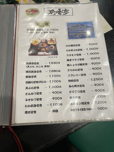 Read more⭐️2つ半です 店の前に4台と道を挟んだ所に駐車場ありました。祝日の11時ジャストに到着しました。すでに数組が待たれていました。すぐ開店して、適当に店に入りカウンターと6名程度のテーブル席、座敷が二手に分かれ有ります。人気店と聞いて来たのですが、店内の衛星面‥汚いです。掃除全く行き届いてなくて畳の上はざらつくし💧テーブルもベト着きました。丹吾定食を頼みました。エビ2つと野菜の天麩羅、カンパチ〔ハマチ?〕アジ・鯛・イカの4種のお刺身、サザエとタコの小鉢、もずく酢、お吸い物、漬物、ご飯。思った程にボリューミーには感じません。残念な事にお刺身が温いのです😔温いお刺身には残念です。美味しかったのはもずく酢!もずく自体が細いのに歯応え有って、少し甘すぎる味付けですが1番いけました👍後はとにかく普通です。特徴とかずば抜けて!とかは無いです。なので、皆さん何故早くから大勢押し寄...