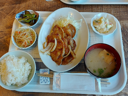 After sightseeing in Hagi, we were looking for a place to have lunch. Luckily, we found Yamamichi Shokudo. The interior looks nice with its heavy wooden tables, and the kitchen is right in the restaurant. Obviously, they cook the food fresh, as some items were sold out by around 3 PM. We ordered the ginger pork set meal (Shōgayaki teishoku). Since it was hot outside, we appreciated the cooled free water.