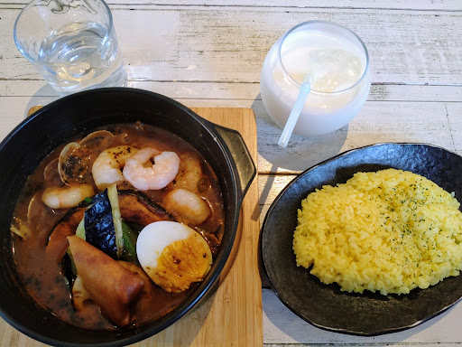 Read moreずーっと気になっていたお店。 なかなか機会がなく、ようやく伺うことができました。 ランチとディナーでメニューが同じようでしたので、ディナータイムに伺いました。 すいてるのを狙い、少し早めの時間にしました。 先客が2組でした。 入店してすぐに、ひとりだと伝えると入口すぐの並んで座れる壁に面した席に案内されました。 荷物が多かったので、椅子が隣にあり良かったです。 スープカレーのお店は、経験が少ないため伺う前にGoogleマップを参考に注文するものを決めていたので、その通りに注文。 ココナッツテイスト、チキンレッグ、辛さ2 ライス少なめ、ブロッコリーと舞茸と牡蠣をトッピング、飲み物はマンゴーラッシーです。 ベースとなるスープ、メイン具材、辛さ、ライスの量、トッピングの順番で頼むそうです😊 特に指定しなかったので、先にマンゴーラッシーが運ばれてきました。 濃厚で美味しかったです。 食後にも飲みたかったので、少し飲んでとっておきました。程なくしてスープカレーも運ばれてきました。 運ばれてから思い出したのですが、直火調理のため、熱いのが苦手な場合は事前に伝えておくと器に変えてくれる旨の説明を見ていたのに、忘れていました。 グツグツと沸騰していたので少し冷めるのを待って頂きました。 スープより先に、トッピングしたブロッコリーを食べましたが『美味しい!』 そのあとスープを一口。 スープはココナッツテイストとのことでしたが海老の風味が1番しました。 想像していたココナッツの風味は、あまりせず。 そしてとてもさらさらでした。 もう少しとろみ的な濃度が欲しい場合は、スペシャルテイストにした方が良いのかなぁ?と、思いました。 あまり辛くない方が好みなので、2にしてみたのですが、本当にマイルドで舌がピリピリすることはなく、飲み込む時に喉にピリッとくる程度の辛さで、食べやすかったです。 欲張ってトッピングをけっこうしたのでライス少なめにしましたが、それでもお腹いっぱいになりました。 全部の具材が美味しかったのですが特にブロッコリーが好みでした。 チキンレッグは、ほろほろでスプーンで食べられました。軟骨はゼラチン状になってました。 残しておいたラッシーも氷がいくらか溶けていたのですが、あまり薄まらず最後まで美味しく頂きました。 満腹で満足でお店をあとにしました。 別のスープ、トッピングも気になるので、...